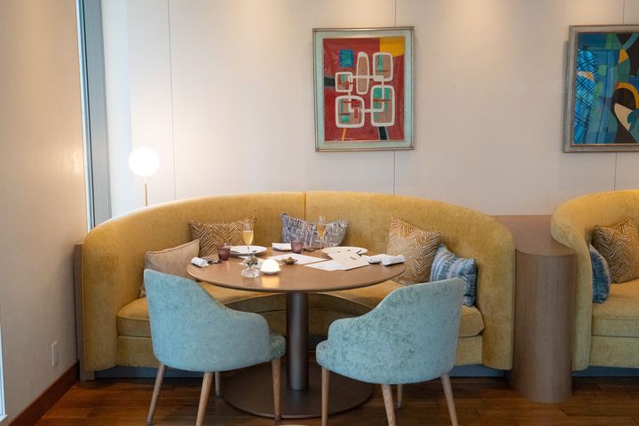 なかでも印象的なのが、ボックスのソファ席。やわらかなクッションと包み込まれるような背もたれが特徴のこの席は、特別感のある空間をつくり出してくれます。周囲との視線がさりげなく遮られていて、まるで静かに浮かぶ小舟のよう。ゆったりとくつろぎながらも、食事のひとときを凛とした空気の中で過ごすことができ、記念日ディナーにはまさに理想的です。