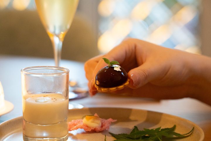 ディナーの最初に運ばれてきたのは、見た目にも美しい華やかなアミューズ。特に印象的だったのは、丸くぽてっとしたフォルムが愛らしい「焼きナスドーム」です。タルト生地の上に乗ったムースはなめらかな食感で、口に含むと優しく香ばしさと深い味わいが広がり、見た目とのギャップに驚かされ、一度で二度楽しめる一品でした。
