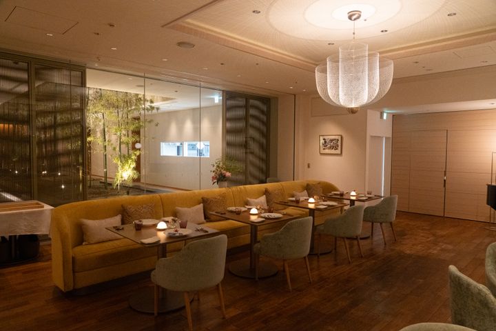 「LʼOrangerie 光庵」のディナータイムの空間は、昼とはまた異なる静かな気品を纏い始めます。柔らかな間接照明が天井や壁をほんのり照らし出し、席に着いた瞬間から、心がすっと落ち着いていくのがわかります。都会の中心にいることを忘れてしまうほど、静寂と穏やかな光に包まれた空間です。