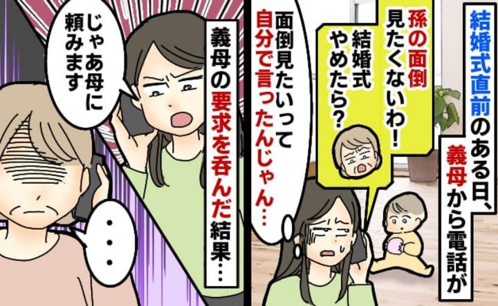 「やっぱり結婚式やめたら? 私、孫ちゃんの面倒見たくないし」と少しイライラした口調で言ってきたのです。そもそも、結婚式中の娘のお世話を買って出てくれたのは義母。それなのに直前になって「面倒を見たくない」と言われ、さらに「結婚式をやめたら?」とまで言われ、私は動揺します。すると義母が「やっぱり私だけ面倒見るのおかしいわよ!」と怒り始めました……。義母から言ってくれたことなのに……と私はモヤッ。