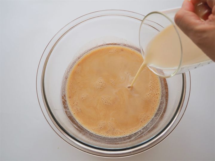 動画では豆乳を使っていたので、今回は豆乳を使用。ちなみに動画の最後で、ばくばクックさんは「牛乳推し」と言っていました。みなさんも、お好みで選んでみてください。