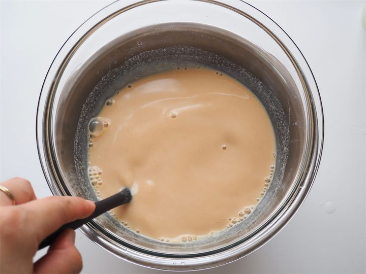 6. 残りの豆乳(250ml)を加え、混ぜながらプリン液の温度を落ち着かせていく。