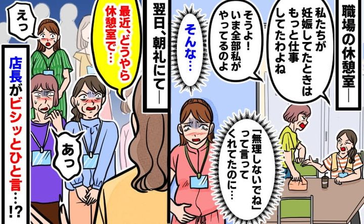 「妊婦って迷惑よね」私には「無理しないで」と言ってたのに…同僚の影口に傷つく私。すると翌日、店長が…!?