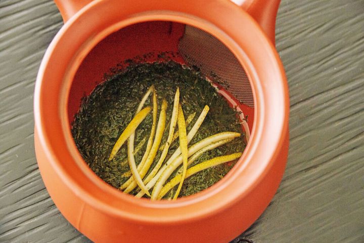 (1)急須(またはコーヒーサーバーなど)に茶葉を入れ、せん切りのレモンの皮を入れてひたひた程度に湯を注ぐ。