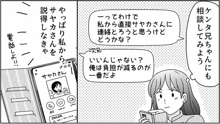 長兄との電話を終え、私は夫にも相談しました。夫は長兄を擁護しているように感じました。夫は介護問題に関わっていないから、悠長なことを言っているのかもしれません。私は次兄にも連絡してみました。長兄や夫以外の意見も聞いてみたかったのです。次兄は独身で、趣味も多く散財しがち。仕事の出張も多いため、自身の負担が減るならなんでもOKと言った様子です。