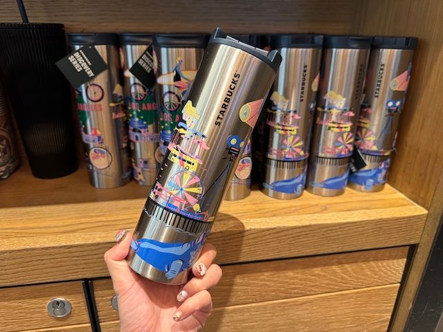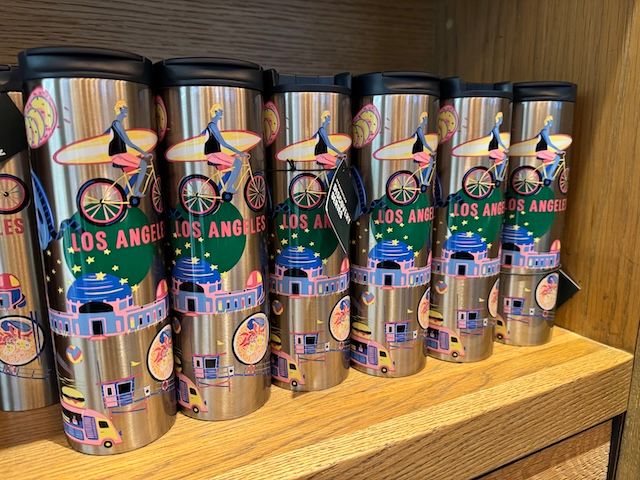 ステンレス製のトラベルマグも人気で、色とりどりのデザインが施されています。基本的にはマグカップと同じ構成ですが、ロサンゼルスの文化やシンボルを表現する映画やストリートアート、地元のグルメ文化など、ロサンゼルスのエネルギッシュな要素が詰め込まれています。