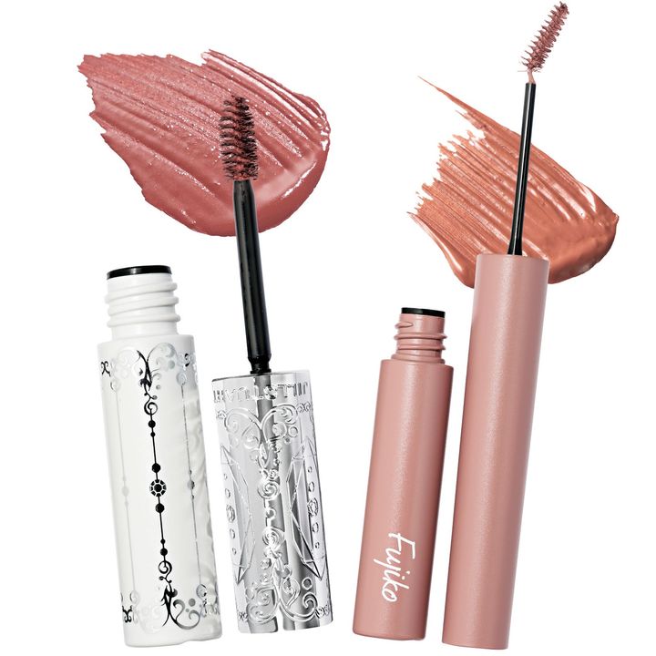 大人がチャレンジしやすい、絶妙な茶系のピンクカラーが◎。左:ふんわりセミマットな質感に仕上げられて、お湯オフできるのが嬉しい。ジルスチュアート ムースブロウマスカラ 08¥2,420(ジルスチュアート ビューティ)右:【モデル使用】肌にベタッとつきづらく、塗りやすい形状。フジコ マジカルアイブロウカラー04 ¥1,408(かならぼ)