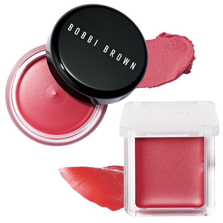 日本人の大半が実はイエローベースの肌。そのため、血色感を仕込むには微かに黄みを含んだローズ色がピッタリ。クリーム系なら密着力も良く、頰が自然に上気して見えます。上:【モデル使用】ボビイ ブラウン ポット ルージュ ベルベット マット グアバパンチ ¥5,500(ボビイ ブラウン)下:ちふれ リップ& チーク バームRD10 ¥550(ちふれ化粧品)