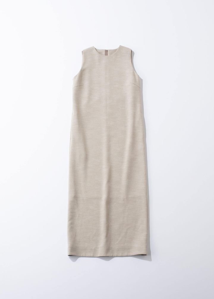キツい印象を出してしまいがちなタイト×ロングワンピース。柔らかなライトベージュとの組み合わせで優しげな印象へ。デザインが控えめなので、小物合わせも充分に楽しめる一品。