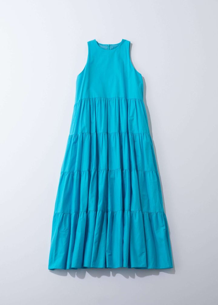 鮮やかなブルーが際立つティアードワンピース。徐々に広がっていくAラインのシルエットは体型カバー間違いなし!ターコイズブルー×クルーネックで首元までしっかり肌を明るく見せてくれそう。