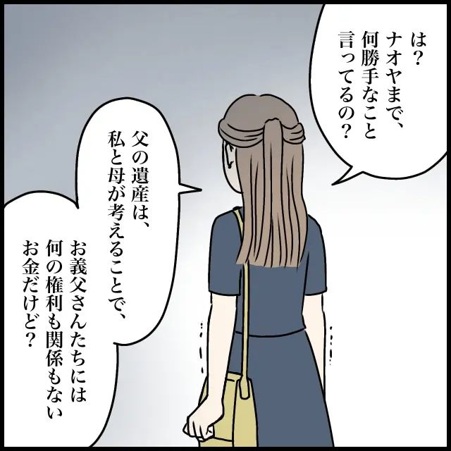 不慮の事故で父親を亡くしたシノブさんは遺された母親を心配し、葬儀の後もしばらくは実家で母親のそばにいました。幼馴染のミホさんとミホさんのお母さんの心強いサポートもあり、母親も気丈に振る舞うように。夫ナオヤさんは「一緒にお義母さんを支えよう」と言ってくれましたが、義両親は葬儀にもかかわらず、会社役員だったシノブさんの父親の遺産や慰謝料など、お金の話ばかりし、義両親の真の姿を理解したシノブさん。久しぶりに実家から自宅に戻ると、勝手に家のモノを使い、散らかし放題でくつろぐ義両親と義姉の姿があって絶句。勝手に泊めたナオヤさんを責めるも、「家族なんだから」とナオヤさんには全く響かず。「うちの家族は距離感が近いから」と言われ、モヤモヤだけが残るシノブさん。その夜、突然ナオヤさんが「あの家お義母さんには広すぎない?」とマンション購入を提案。その上、貰わなきゃ損だとばかりにシノブさんのお父さんの遺産について口を出し、うんざりしたシノブさんが「お母さんが困窮してうちを頼ることは絶対にないくらいあるから」と言うと、ナオヤさんは「え?そんなに・・?」と驚きました。それから一週間後、自宅に帰ったシノブさんは、家の中で寛ぐ義両親を見てビックリ!遺産がかなり入るそうだから、みんなで住む家を建てたらどうかと言い出し、絶句するシノブさんに、「いい考えだよな!」と笑顔で言うナオヤさん。シノブさんは呆然と立ち尽くしていました。