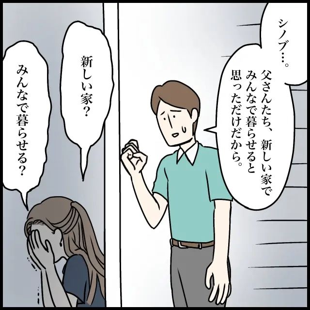 すると、「シノブ・・。父さんたち、新しい家で、みんなで暮らせると思っただけだから」と両親をフォローするナオヤに、「新しい家?みんなで暮らせる?」泣きながらそう言うと、
