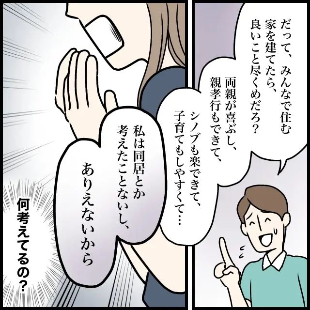 「だって、みんなで住む家を建てたら、良いこと尽くめだろ?両親が喜ぶし、親孝行もできて、シノブも楽できて、子育てもしやすくて・・」必死に家を建てるメリットを並べ立てるナオヤに、「何考えてるの?」と思いながら、「私は同居とか考えたことないし、ありえないから」と冷たく言い放ったのでした。