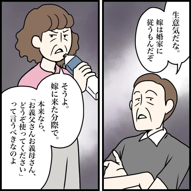 「生意気だな。嫁は婚家に従うもんだぞ」と義父。「そうよ。嫁に来た分際で。本来なら、『お義父さんお義母さん、どうぞ使ってください』って言うべきなのよ」とペットボトル片手に義母までもがそう言い、