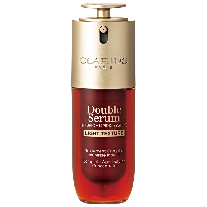 人気の2層式美容液の機能はそのままに、水分7、油分3の黄金比で軽やかテクスチャーにチェンジ。潤いで肌を満たす。 50ml ¥17,380(クラランス)