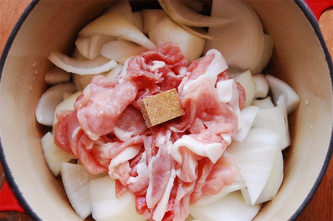 1. 鍋に玉ねぎと豚肉、水、コンソメを入れます。豚肉は切らずにそのままIN。