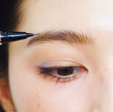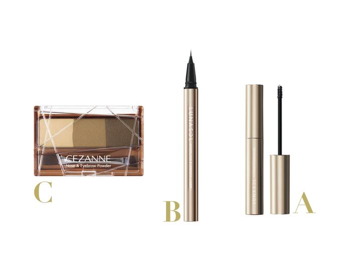 色では誤魔化さず毛の存在感を出すとヘルシーな印象に。Aの透明マスカラで毛流れを整え、足りない部分はBのリキッドペンシルで描き足す。そのままだと素眉すぎるので最後にCのパウダーを少量のせメイク感を。