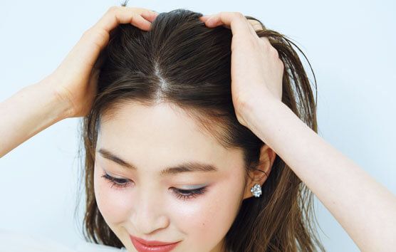 オイルをそのまま使うとベタつき感が出るので、一度、水で濡らしてからオイルを手に馴染ませ前髪から毛先につける。パラパラとした束感のある前髪を垂らして。眉も色がついてないので全体的に毛流れが強調されヌーディに。