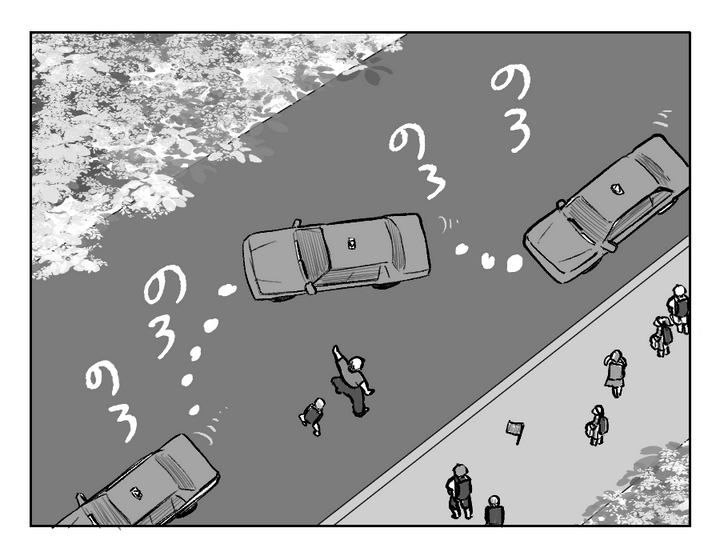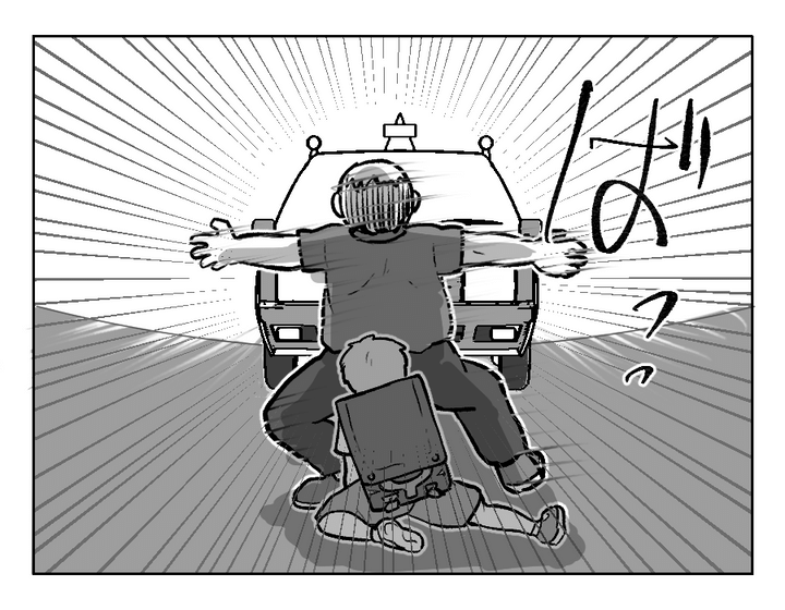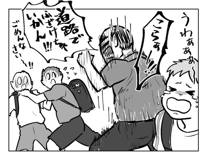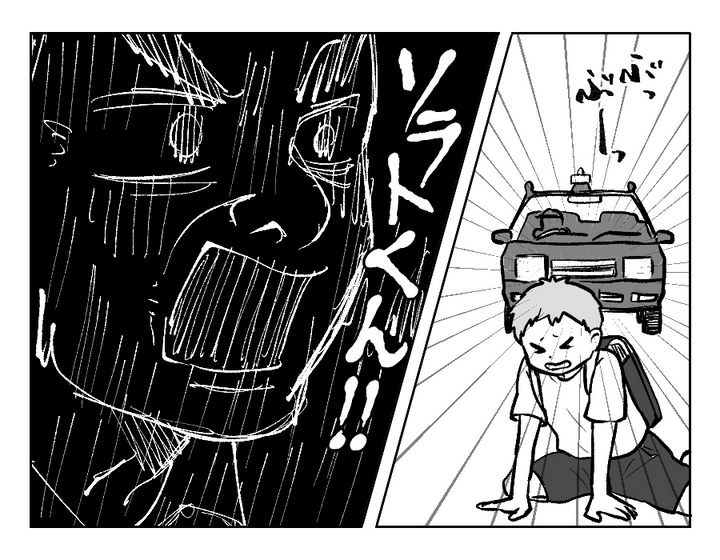 今日は斎藤家のおじいちゃんが旗振り当番をしています。自分の孫ユウマくんと隣家のお孫さんソラトくんを見送っています。しかし、そのときソラトくんがふざけていた上級生に押されて道路に突き飛ばされる瞬間を目撃しました。