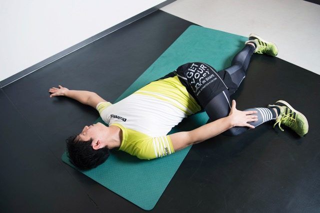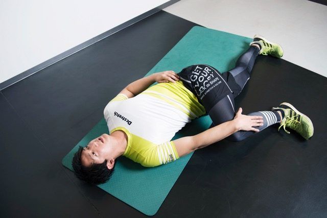 ▲キープ時に倒した脚のひざが浮いてしまうと十分に腰周りや背中を伸ばすことができないので注意