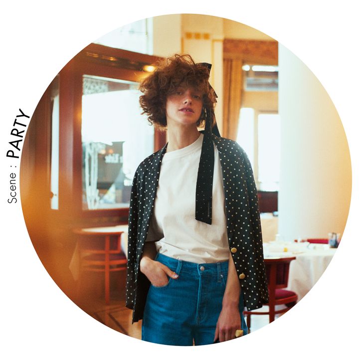 白T、デニムパンツは着まわし。キレイ色や柄のジャケットやカーディガンを合わせやすくなるのも、白Tとデニムならでは。たとえばノーカラーのドット柄ジャケット。黒をベースにした細かな白ドットなら、浮かずにほんのりクラシックな淑女ムードに。 ドット柄ジャケット/サンタモニカ原宿店 髪につけたリボン/TSURU By MARIKO OIKAWA