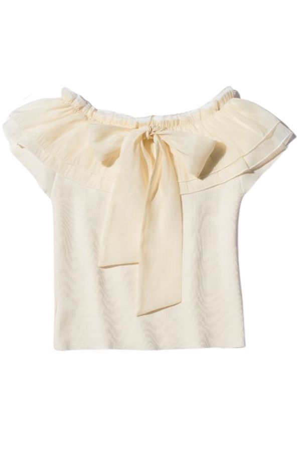フレンチスリーブニットなら、半袖ジャケットのインにも適任。リボンをフロントからのぞかせれば、フォーマル感がありながら華やかな美人感。