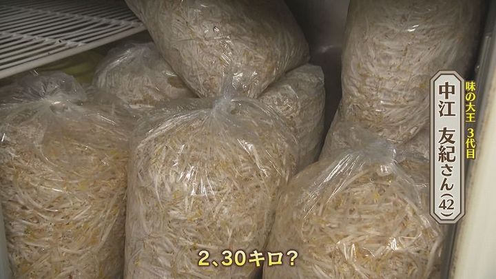番組スタッフ:「もやしは一日どれくらい使うんですか?」3代目 中江 友紀さん:「もやし?1日2,30キロ?」