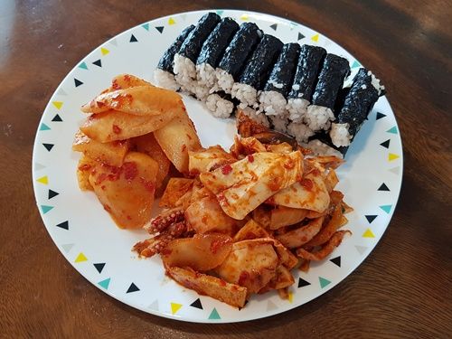 具を入れずに白ご飯だけを海苔で巻いた、ミニサイズのシンプルなキンパプ。大根のキムチやイカの和え物を添えて食べるのが特徴だ。1950年代、漁師たちが暑い日でも傷まないようにと具を抜いたのがはじまりだといわれている。