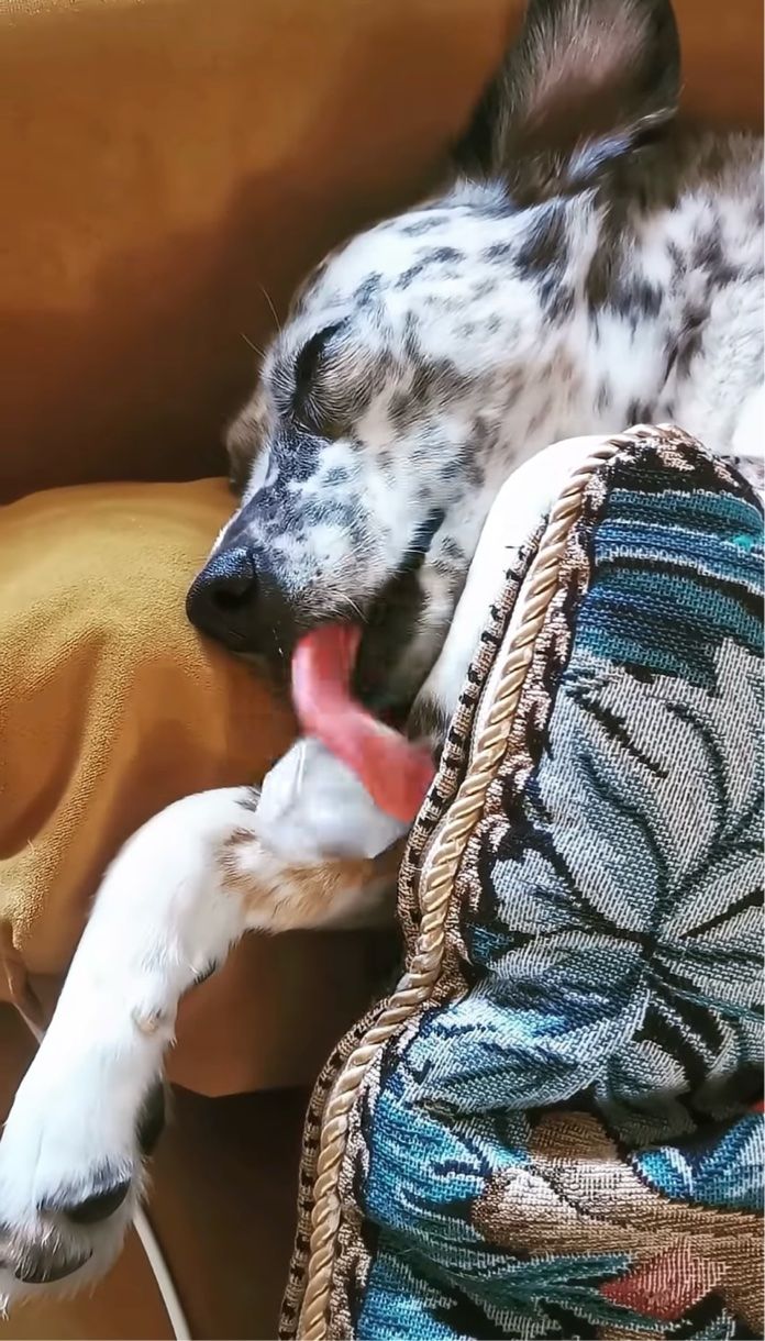 飼い主さんが捉えたのは、横になって寝ようとしている愛犬の姿。 しかし、寝る直前だというのに、この子はぼんやりしたまま何かをペロペロしています!