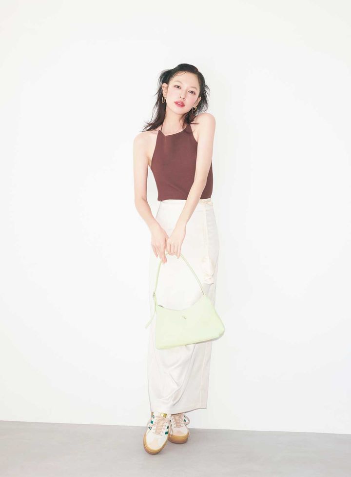森絵梨佳。ar7月号より キャミソール¥5,500/ココ ディール スカート¥24,200/ロザリームーン(ロザリー) イヤリング¥3,300/アネモネ(サンポークリエイト) バッグ¥8,520/ムクアンドエボニー (ハナ コリア) スニーカー¥16,500/アディダス オリジナルス(アディダス お客様窓口)
