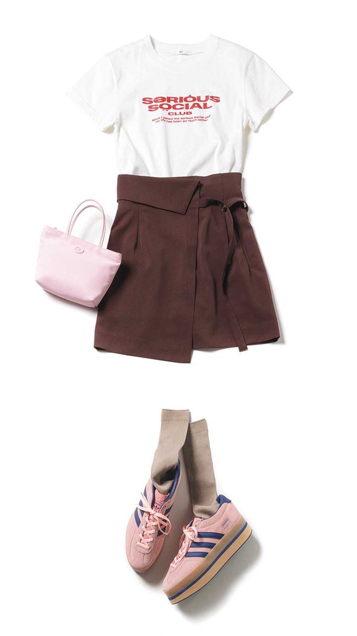Tシャツ¥3,850/スライ(バロックジャパンリミテッド) スカート(パンツとセット)¥12,100/ココ ディール バッグ¥14,080/ミニットミュート(ハナ ショールーム) ソックス¥1,430/靴下(タビオ) スニーカー¥16,500/アディダス オリジナルス(アディダス お客様窓口)