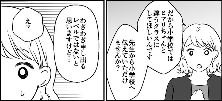 ヒマリちゃんとは小学校も同じのようなので、小学校に配慮を求めたいと私は考えていました。その旨を、幼稚園から小学校に申し送りしてもらいたいと打診をしたのですが「わざわざ申し出るレベルではないと思いますけど……」と、担任の先生に言われてしまい私は戸惑ってしまうのでした。