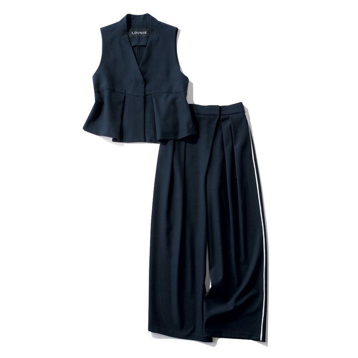 華やかなペプラム形のショートジレと脚がスラリと見えるワイドパンツのセットアップ。マシンウォッシャブルかつ、ノンアイロンで、とにかくお手入れが楽ちん。ジレは前を開けても閉じても着用可能です。ジレ¥24,200パンツ¥22,000(ともにルーニィ)