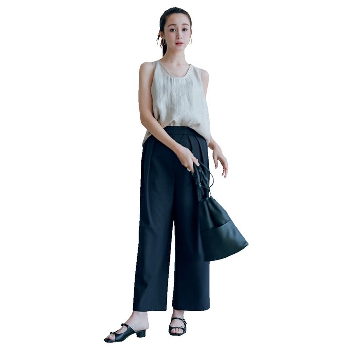 Vネックでスッキリ涼しげ。切り替え位置高めのショートジレはスタイルアップ効果も。小物は白やシルバーを合わせて、夏のネイビーを暑苦しく見せない工夫を。ジレ¥24,200パンツ¥22,000(ともにルーニィ)バッグ¥10,900(CHARLES & KEITH/CHARLES & KEITH JAPAN)パンプス¥72,600(ペリーコ/アマン)イヤリング¥16,500(タルパ/ススプレス)チョーカー¥4,950(GOLDY)バングル¥9,720(アビステ)リング¥20,900(イットアトリエ/フォーティーン ショールーム)