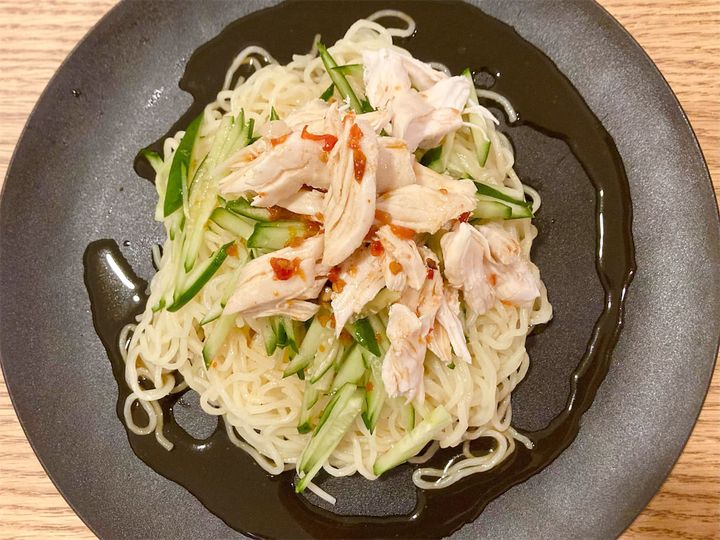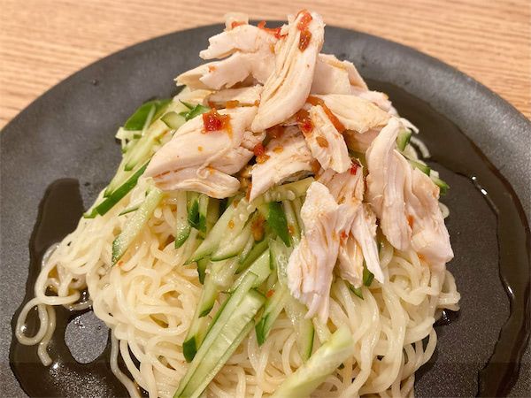 冷たい麺と具材に、香ばしくてピリ辛な甘酸っぱいたれがよく絡み、どんどん箸が進みます。酸味も辛さも強すぎず、バランスの取れた味わい。具材がシンプルなぶん、たれのおいしさが際立っています。ささみはレンジ調理とは思えないほどしっとり柔らかく、簡単なのに満足度の高い仕上がりです。