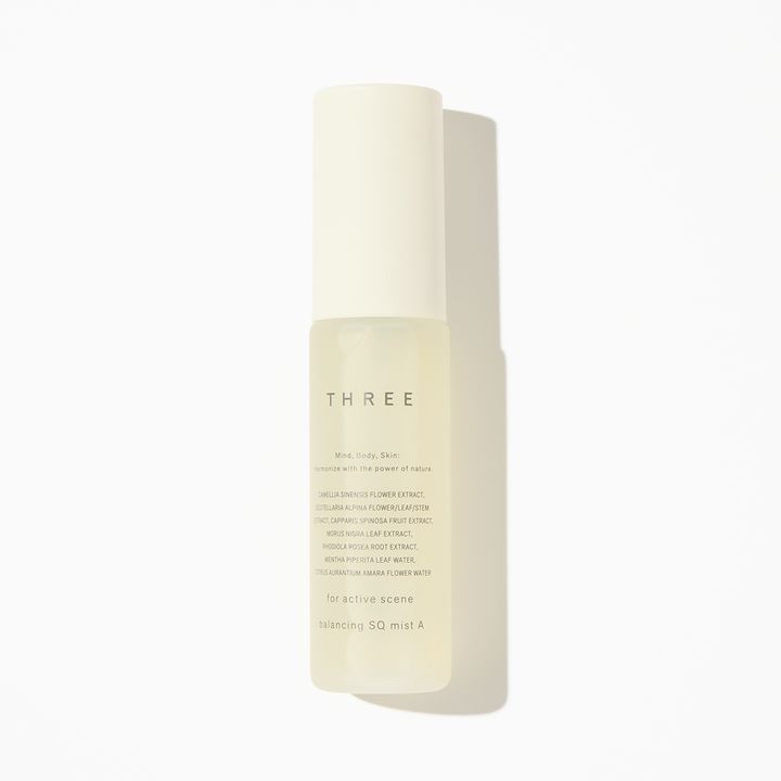 削ぎ落としたあとの肌には、フェイスケアと同じくらいの丁寧な保湿がマスト。おすすめは、スプレータイプで手の届きにくい背中にもかけやすいTHREE バランシング SQ ミスト。ナチュラルな香りとともに、肌にみずみずしいうるおいを届けてくれます。