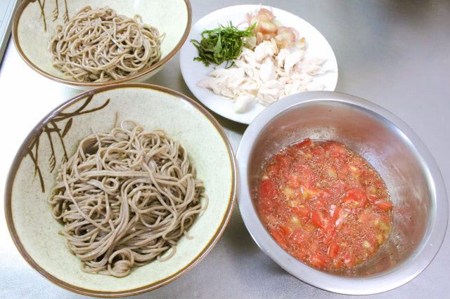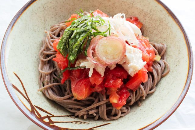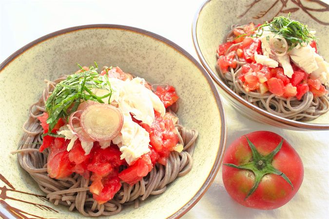 そばは和のイメージが強く、めんつゆやだしで食べるのが一般的。トマトを合わせれば、食卓で目を引くこと請け合いです!