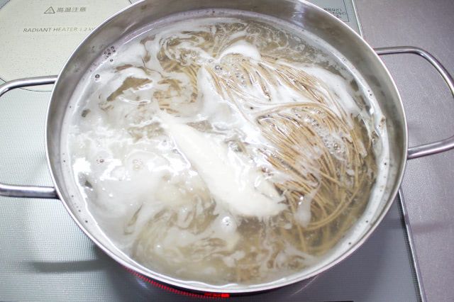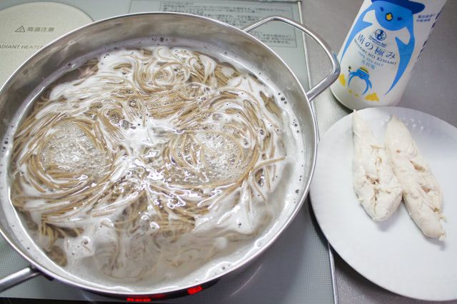 ささみは3分ほど茹でて引き上げ、粗熱が取れたら、ほぐして塩を振りました。そばはそのまま茹で続け、4分30秒経ってから、火を止めました。