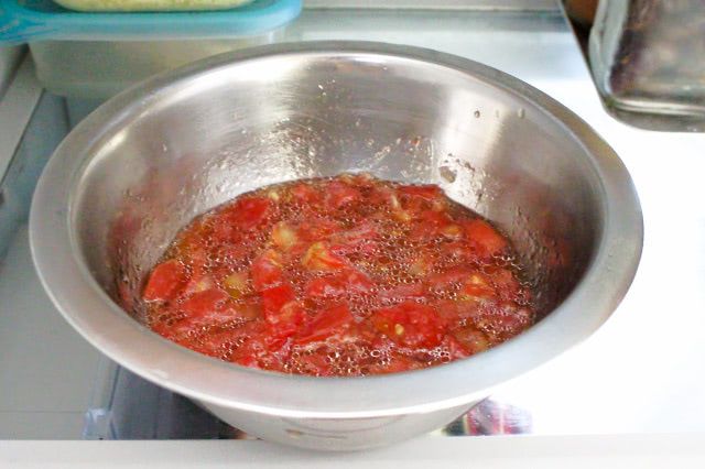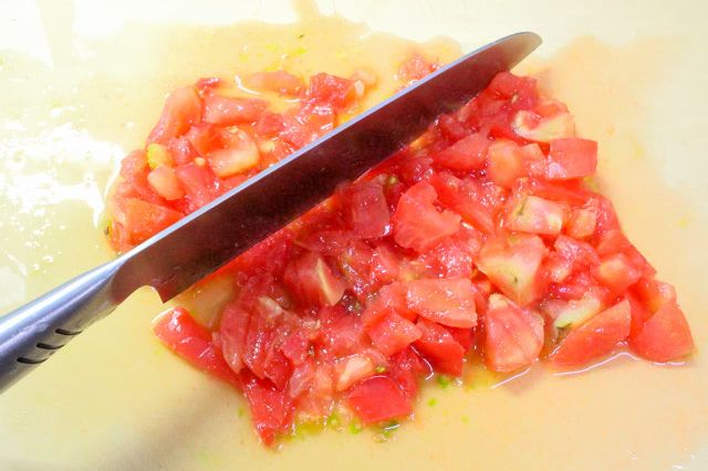 1. トマトを粗く刻み、包丁でよく叩いてペースト状にします。