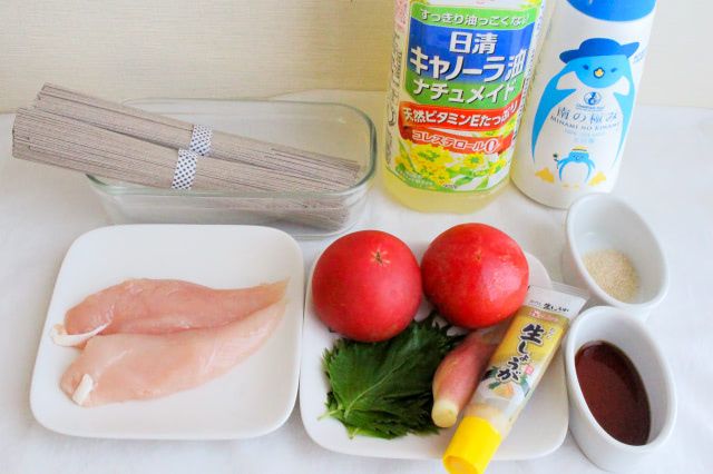 器にそばを入れて、1の冷やしたトマトだれをかけます。4のささみ、3のみょうがと青じそを乗せたら、完成です。
