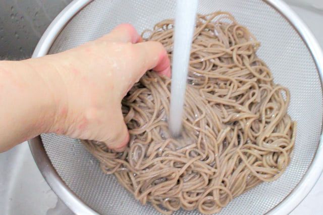 そばはそうめんほどぬめりがないので、サッと洗って水気を切りました。