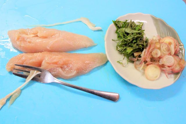 3. みょうがを小口切りに、青じそを千切りにします。ささみの筋は、取り除いておきます。