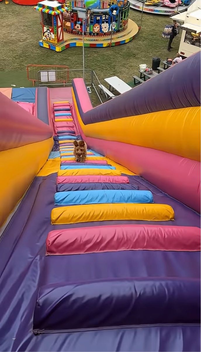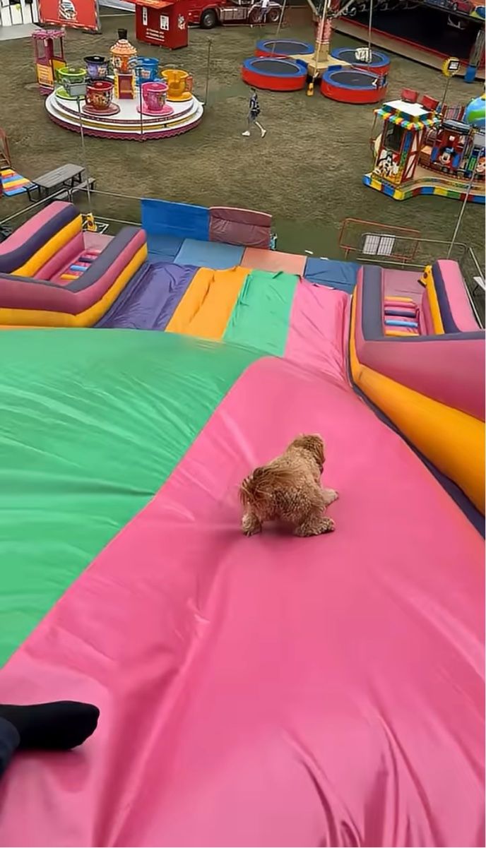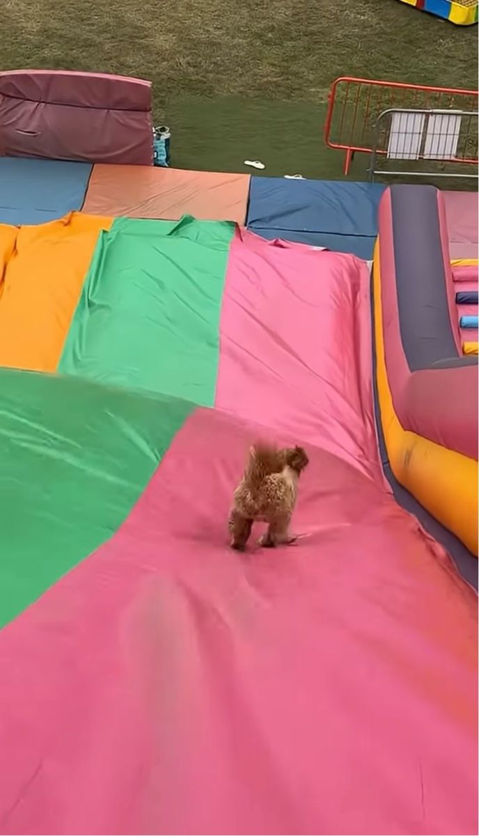巨大すべり台を勢いよく滑り降りていくのは、ミニチュア・コッカープーの子犬。 その小さな背中からは、珍しい遊具に胸を躍らせている様子が伝わってきます!