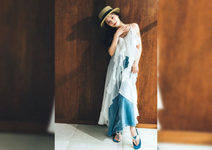 サンダル「srGODIVA PRECIOUS」[H1.5]¥144,100/ セルジオ ロッシ(セルジオ ロッシ  カスタマーサービス) フリルキャミワンピース¥24,200/マイストラーダ デニムパンツ¥16,500/ヘルシーデニム (アンタイトル) ストローハット¥13,200/オーバーライド(OVERRIDE 神宮前) バングル¥16,500/ステラハリウッド