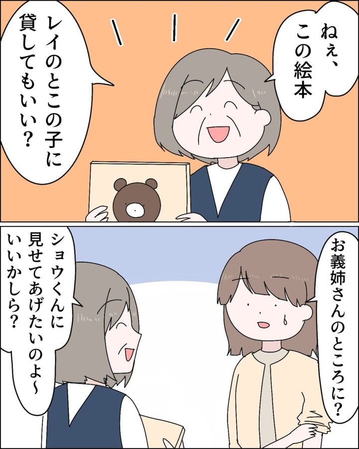 義母は一冊の絵本を手に取ると、「ねぇ、この絵本。レイのとこの子に貸してもいい?」と聞いてきました。レイさんは、ヒロムのお姉さん。義母にとっては外孫の、2歳の男の子ショウくんがいます。