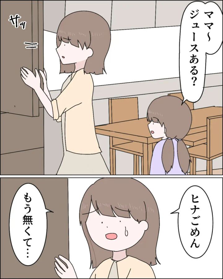 保育園から帰ったらジュースを飲むことを楽しみにしていたヒナ。でも3パック買い置きしていたジュースは全て義母に一気飲みされてしまったのでもう残っていませんでした。