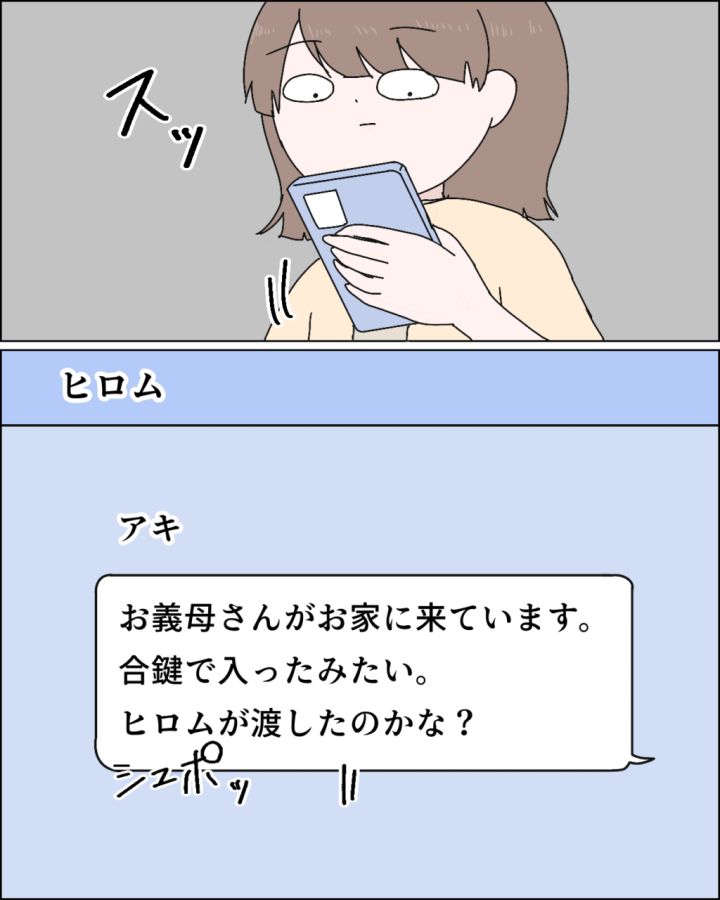私は無言で夫ヒロムにメッセージを送りました。『お義母さんがお家に来ています。合鍵で入ったみたい。ヒロムが渡したのかな?』