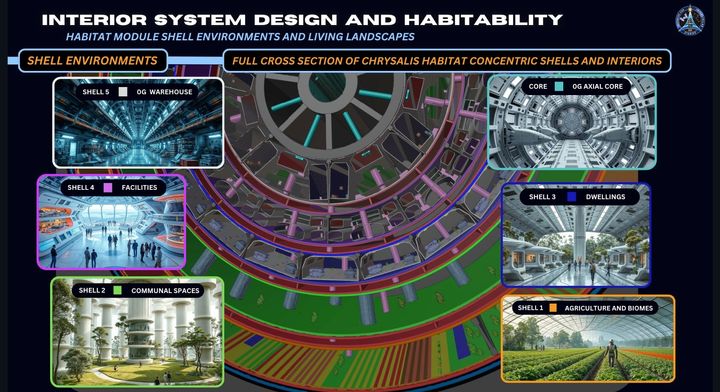全長約58キロメートルを想定しているクリサリスは人工重力を生み、内部に学校や病院、工場、森林までも備えます。