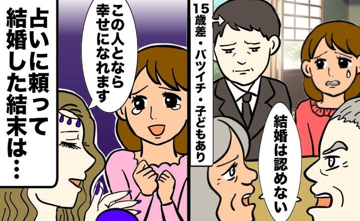彼は15歳上、バツイチ、子どもあり。そのため、彼との結婚は周囲から大反対を受けました。それでも「幸せになれる」という占いの言葉に背中を押され、私は結婚を決意。しかし数年後、それを悔やむ出来事に遭遇するのです。