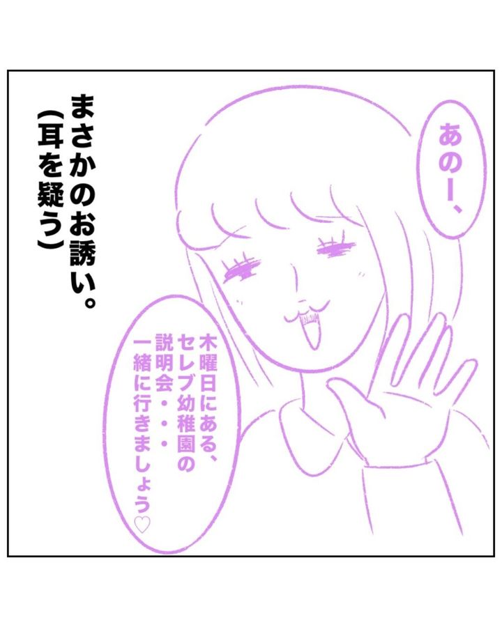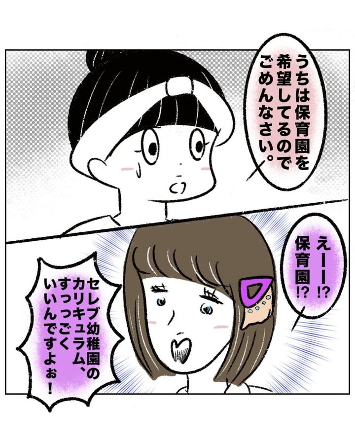 「うちは保育園を希望してるのでごめんなさい」とまるさんが答えると、ゆかちゃんママは「えーー!?保育園!?セレブ幼稚園のカリキュラム、すっっごくいいんですよぉ!」と激しく驚き、